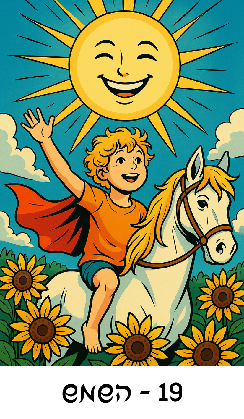 בקלפי המיסטיקון אנו רואים ילד רכוב על סוס לבן, מתבונן קדימה בשמחה, גלימה אדומה מתנופפת מאחוריו. מעליו שמש גדולה מחייכת בחום, וסביבו חמניות מלבלבות. הילד מסמל תמימות, חופש ושובבות בריאה; הסוס הלבן מסמל טוהר ויושרה; והשמש המחייכת היא מקור של חיים, בהירות ותקווה.