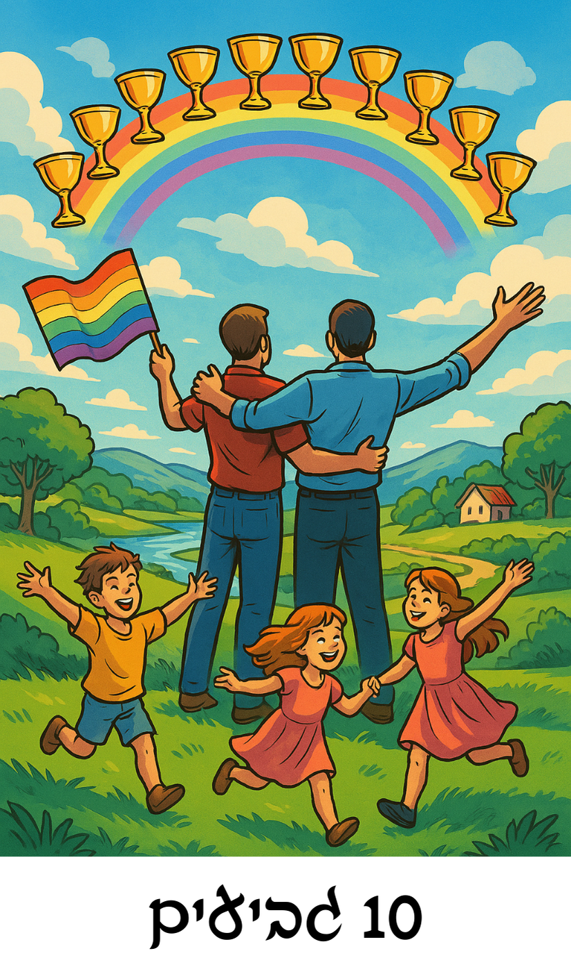 בקלף נראה זוג מחובק מביט אל קשת צבעונית של גביעים הנוצצת מעל שמים כחולים. סביבם - ילדים משחקים, טבע ירוק, ודגל הגאווה מתנופף ברוח חופשית.
